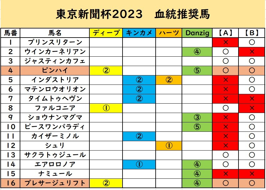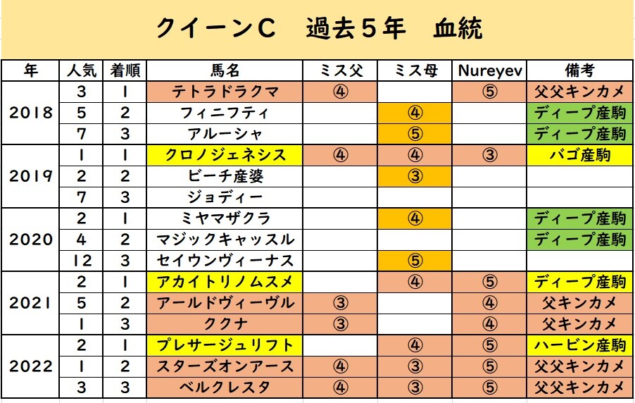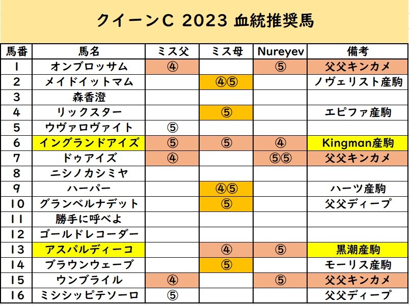 オレンジで塗ったのは「ミスプロ×Nureyev」ではないけど「母系にミスプロ」を持つ馬