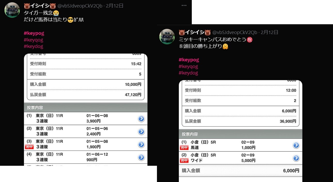 …Twitterで「#keypog」で指名馬絡みの馬券をツイート
