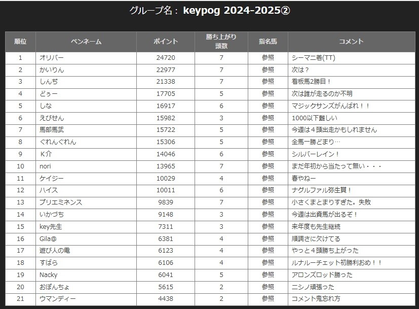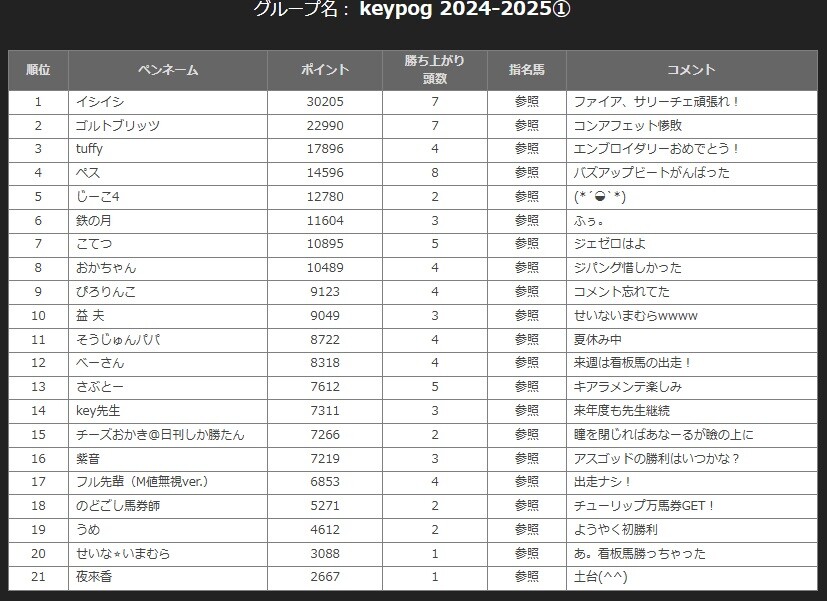 →参加者は「keypog馬絡みの馬券(的中馬券の中にkeypog馬が1頭いればOK)」の買い目をコメント欄に記載