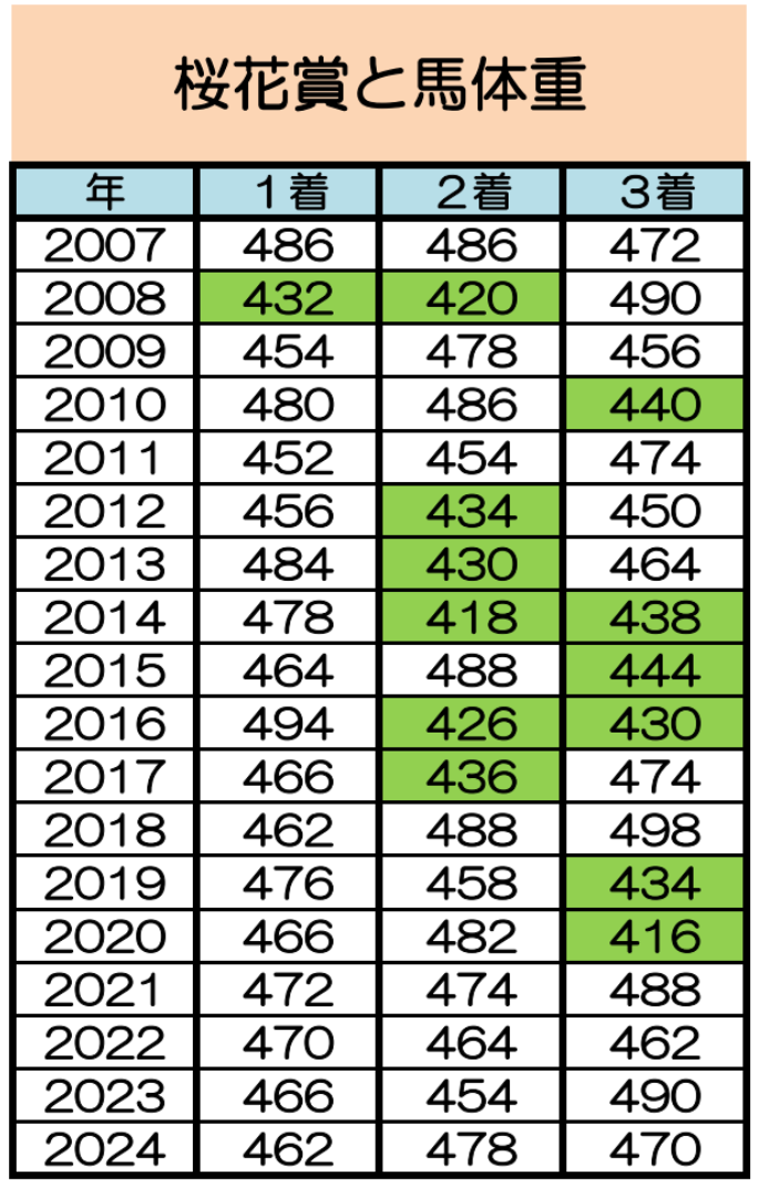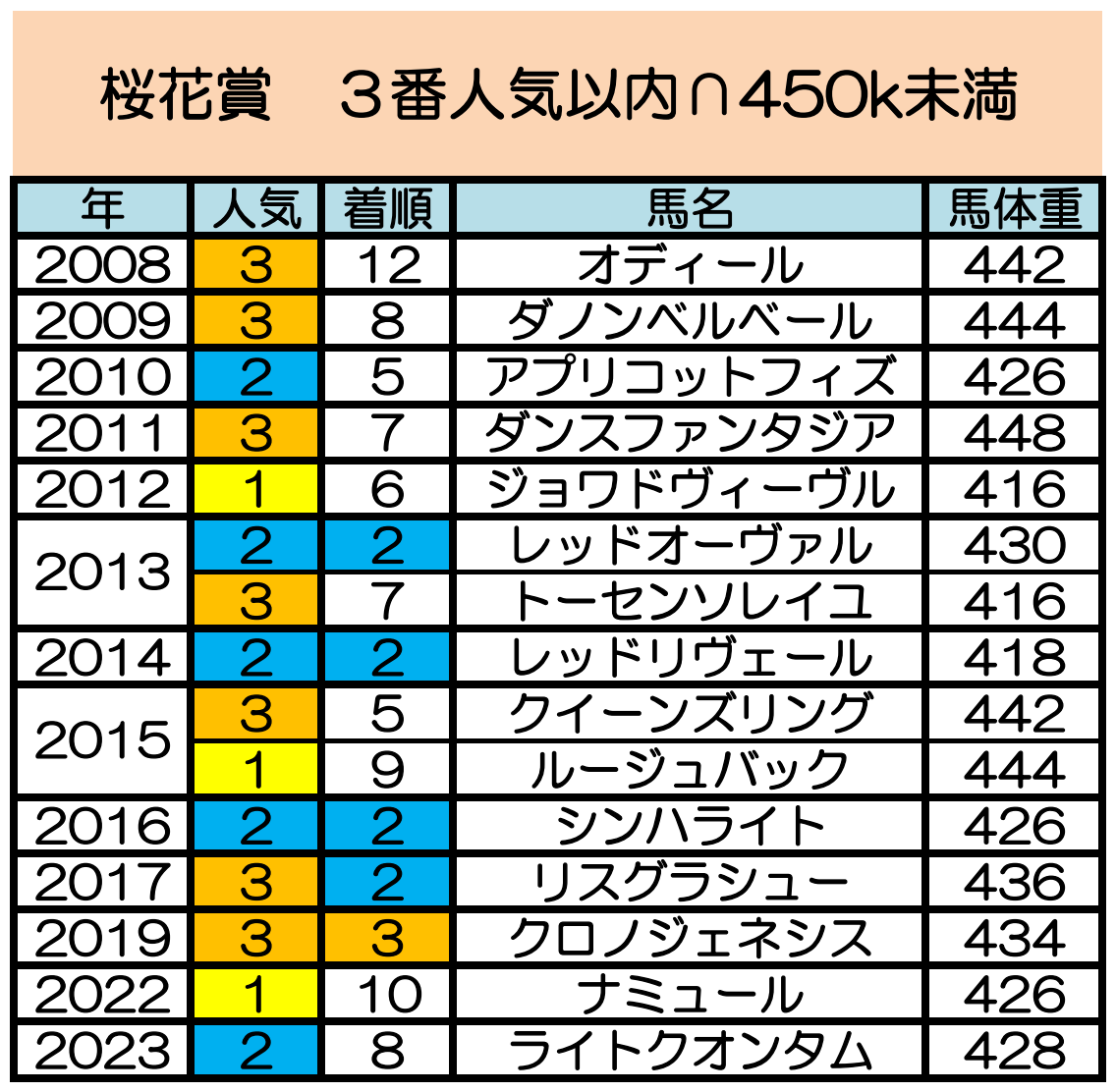 「馬体重450k未満」の馬は桜花賞が阪神外回りで行われるようになってから