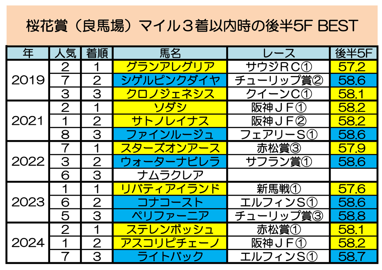 良馬場施行の桜花賞では過去5年のうち、4年で年明け初戦の馬が優勝しているのも納得です。