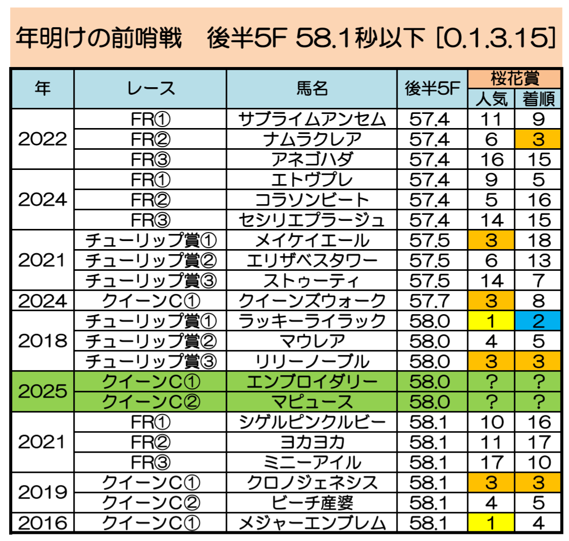 黄色で塗った「後半5F 58.2秒以下」の経験がある馬が