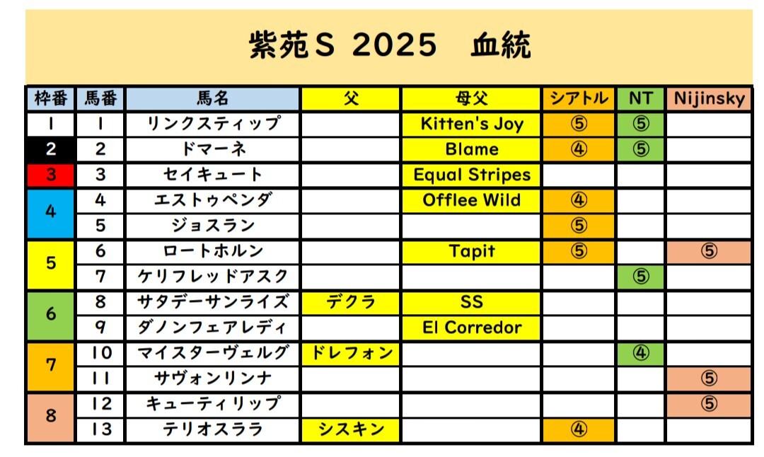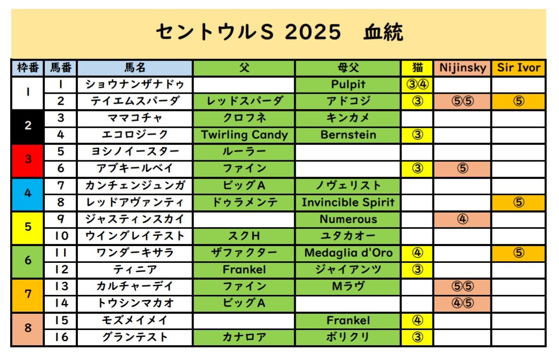 この7枠2頭(Nijinskyクロスコンビ)を1,2着。1,3着にサンドイッチして3連単万馬券を狙いたい!